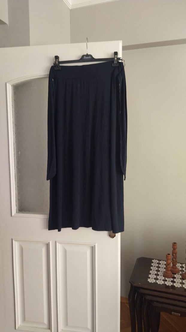 Lacivert uzun etek, dökümlü tasarıma ve salaş kesime sahip. Düz, minimalist tarzıyla günlük kullanıma uygundur. sıfır ürün
