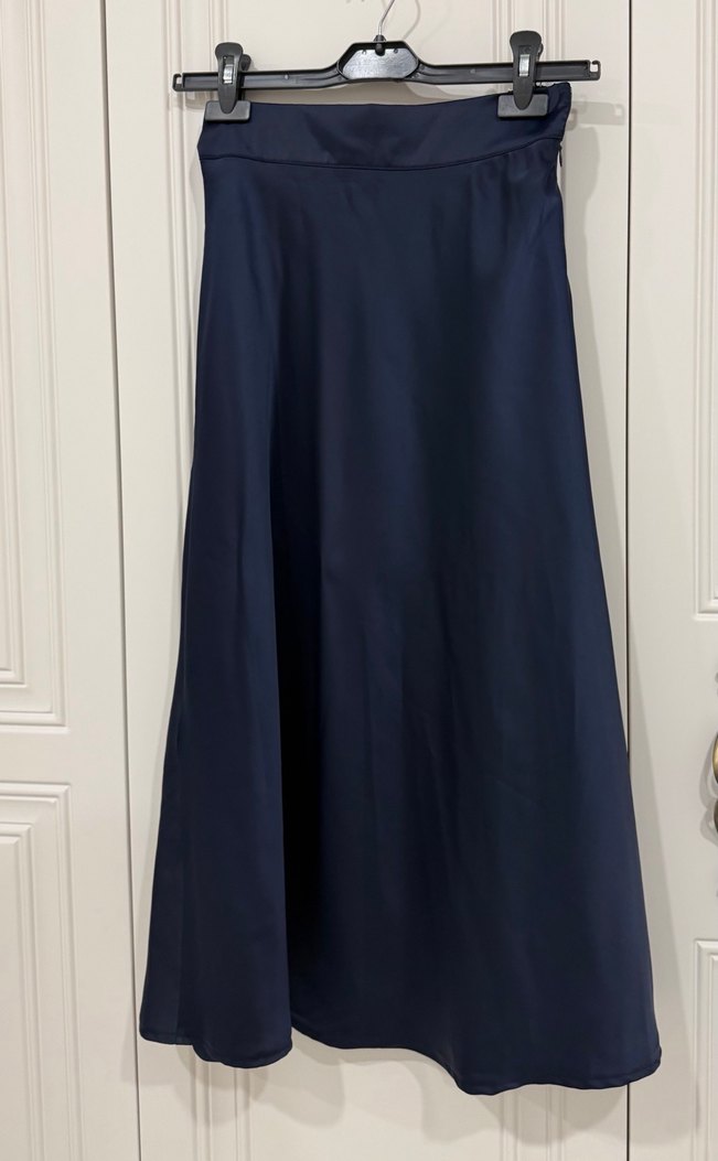 Lacivert, uzun, saten dokulu ve drapeli bu etek, regular fit kesimiyle ofis için uygun sade ve normcore bir tarza sahiptir. Boyu 84 cm’dir