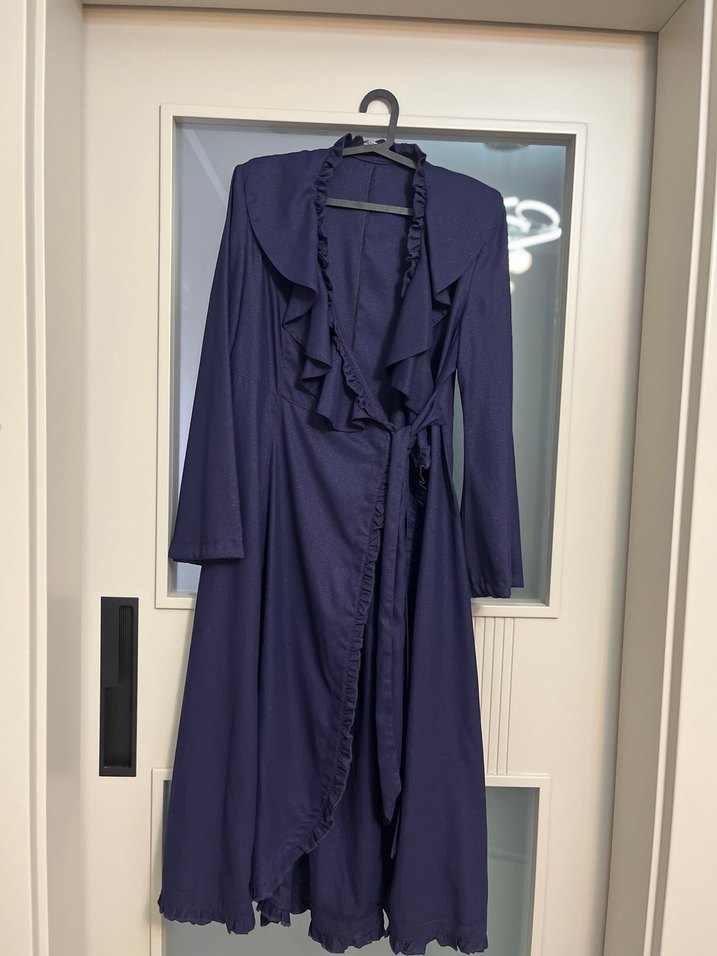 Lacivert uzun abaya drapeli tasarımı ve kesik yaka detaylarıyla dikkat çeker. Uzun kollu ve düzenli kesimlidir, özel gün ve normal güne uygundur