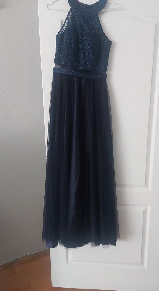 Lacivert Uzun Straplez Kemerli Abiye Elbise