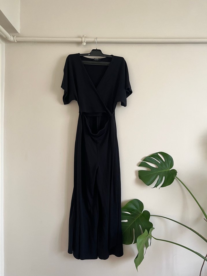 Koyu lacivert uzun tulum, V yakası ve ön kısmında göbekte dekoltesi var. Kullanılmıştır.