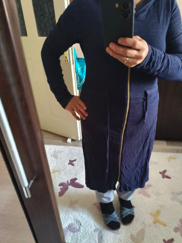 Lacivert renkli, penye kumaştan uzun ve penye tunik önü fermuarlı yan yırtmaç detayına sahip günlük kullanıma uygun rahat bir modeldir.