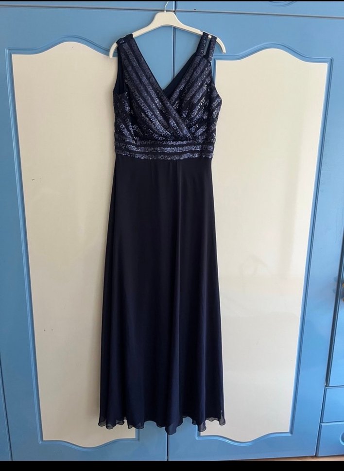 Lacivert, drapeli V yaka ve kolsuz uzun etekli, klasik ve şık bir abiye elbisedir. Düğün ve özel davetler için uygundur. ✨