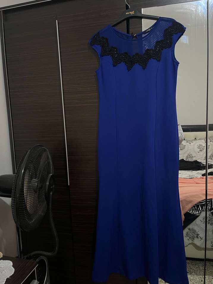Lacivert Uzun V Yaka Kadın Abiye Elbise