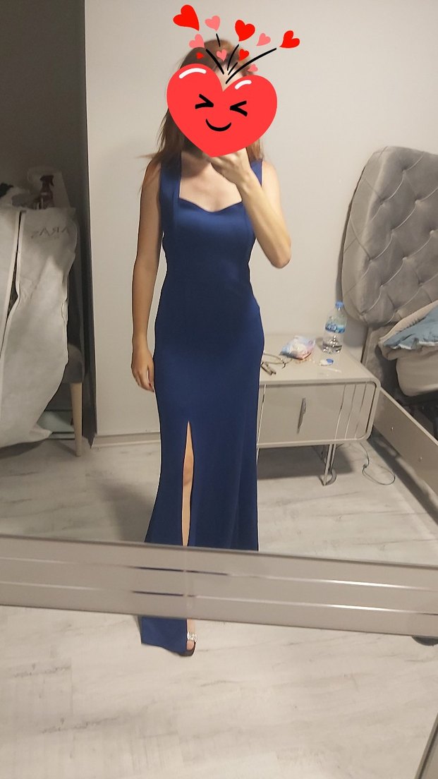 Lacivert parlak kumaştan, V yaka, uzun ve dar kesim, önde yırtmaçlı, minimal ve çağdaş tarzda abiye elbise.