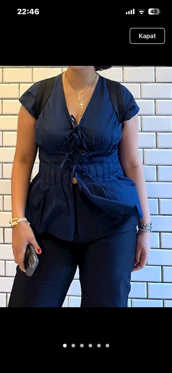 Lacivert, V yakalı bir bluz. Ofis için uygun cesur bir tasarım.