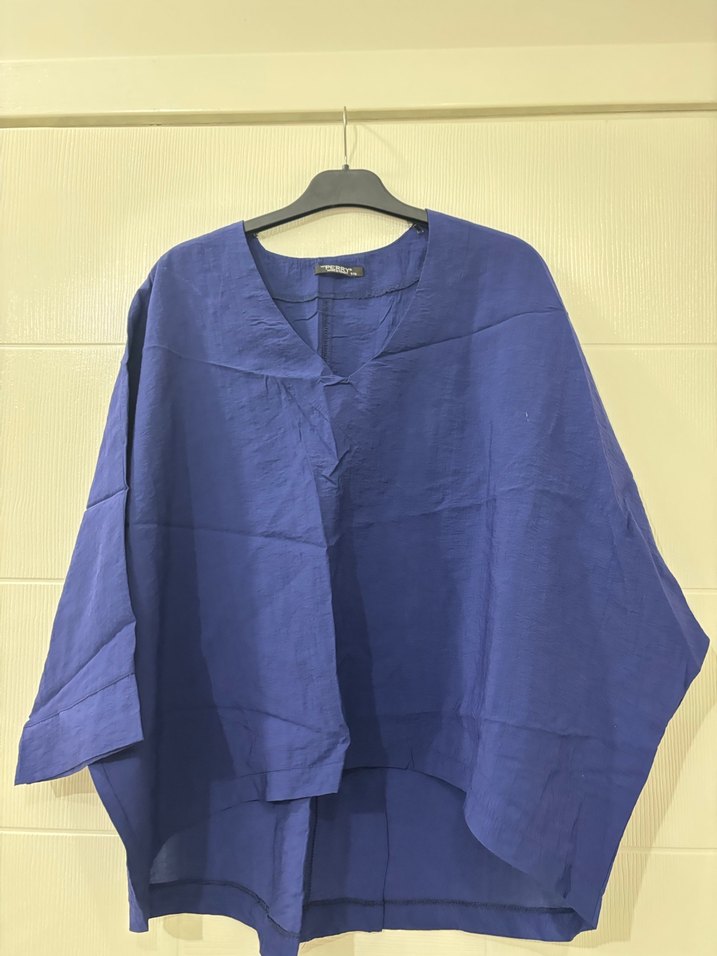 Yumuşak keten kumaştan yapılmış bol kesim kadın gömlek, V yaka ve uzun kollu. Lacivert renkte, midi boyda, günlük kullanıma uygun sade ve minimal tarzda.