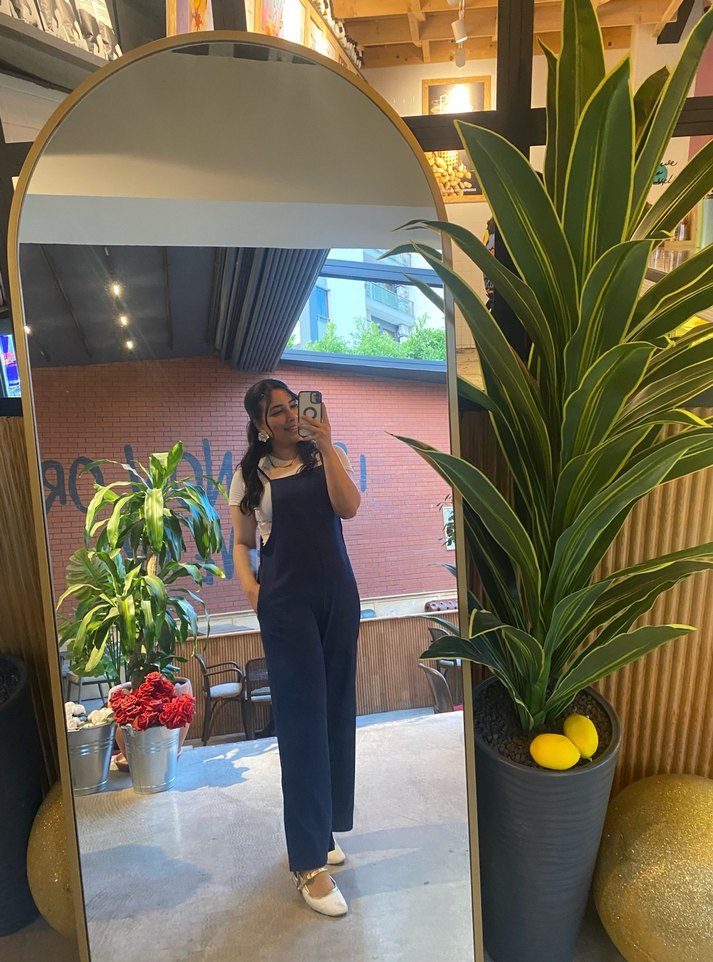 Lacivert tulumu, V yaka ve kolsuz tasarımıyla koyu renkli batik denim kumaştan üretilmiştir. Rahat bir görünüm için normal kesim ve midi boydadır.