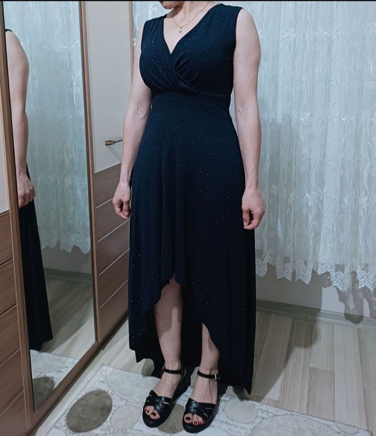 Lacivert, v yaka ve drapeli tasarıma sahip, askılı kolları olan, uzun ve dar kesim abiye elbise. Romantik akşamlar için uygun, gotik şıklık sunar. Ön kısa, Arkası uzun lacivert simli abiye, 1 kez giyildi, likralı M/38 bedendir. V yaka, ön kısa arka uzun(asimetrik kesim), Şifon etekli, zarif gece elbisesi. Kaliteli, dökümlü ve hafif parlak kumaş. Düğün, nişan, mezuniyet, davet veya özel akşamlar için mükemmel bir tercih. Simli detayları ışıkta çok zarif parlıyor, vücuda oturan kesimiyle şık bir görünüm sağlar. Profilimdeki diğer abiye/elbise modellerine de göz atabilirsiniz #geceelbisesi #mezuniyetelbisesi #davetelbisesi #lacivertelbise #simlielbise #kadınmoda #zarifelbise #şıkstil #yenigibi #abiyemoda #abiye #kadın #simliabiye