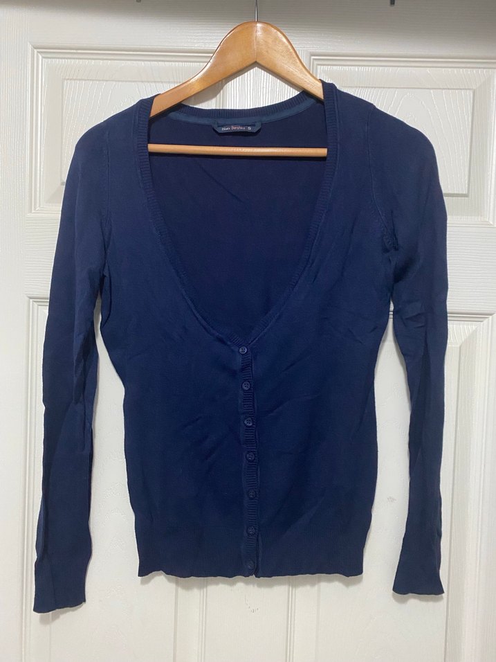 Sayılı giyildi. Lacivert, düğmeli, uzun kollu, V yaka, pamuklu ince ve normal boyda, minimalist normcore tarzda kadın hırka.