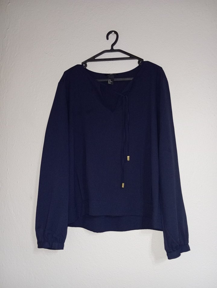 Lacivert renkte, uzun kollu ve düğmeli V yakalı, bol kesim kadın bluz. Günlük rahat kullanıma uygun, sentetik dokulu kumaştan yapılmıştır.