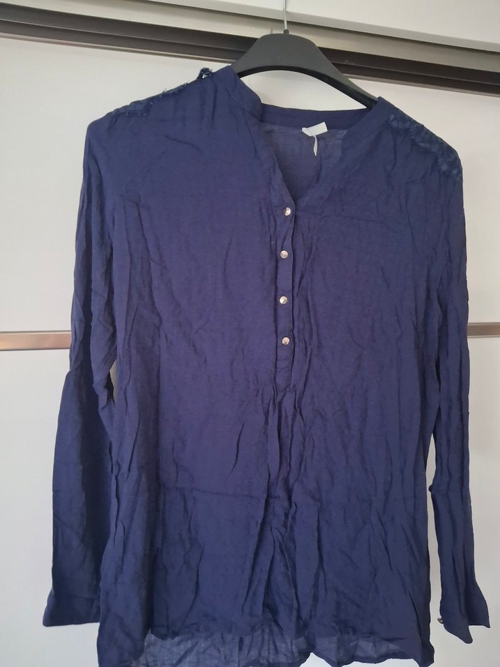 Lacivert keten kumaştan, V yaka ve düğmeli ön detaylı, uzun kollu, bol kesim kadın gömlek. Günlük rahat kullanım için uygundur.
