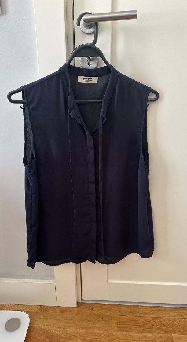 Lacivert, kolsuz, düğmeli ve V yakalı bu bluz, satenimsi dokusu ve bol kesimiyle ofis veya günlük kullanıma uygun.people fabrika marka 38 beden az kullanılmış