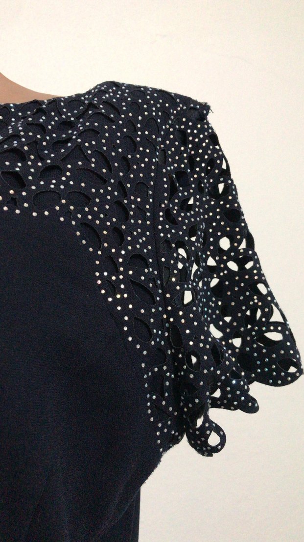lacivert renkte, V yakalı ve askılı kollarında fırfır detaylara sahiptir. Desenli sentetik kumaşı gotik Paris tarzı yansıtır, romantik akşamlar için uygundur.