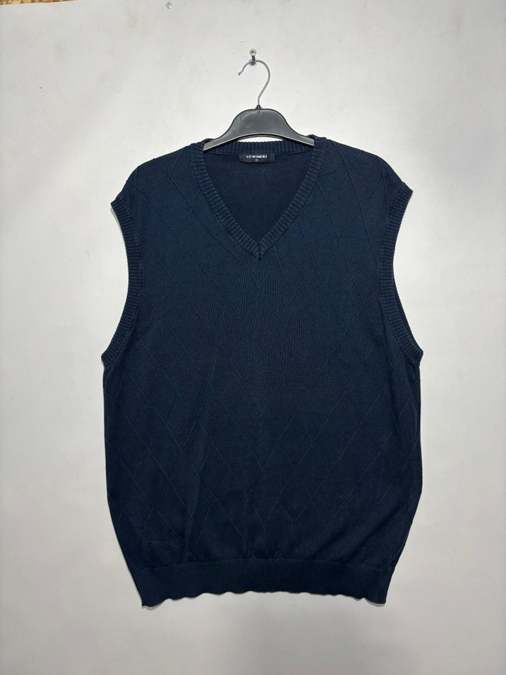 Lacivert renkte, V yaka, kolsuz, triko dokuma erkek süveter. Rahat kesimi ve midi boyu ile gündelik kullanıma uygundur.