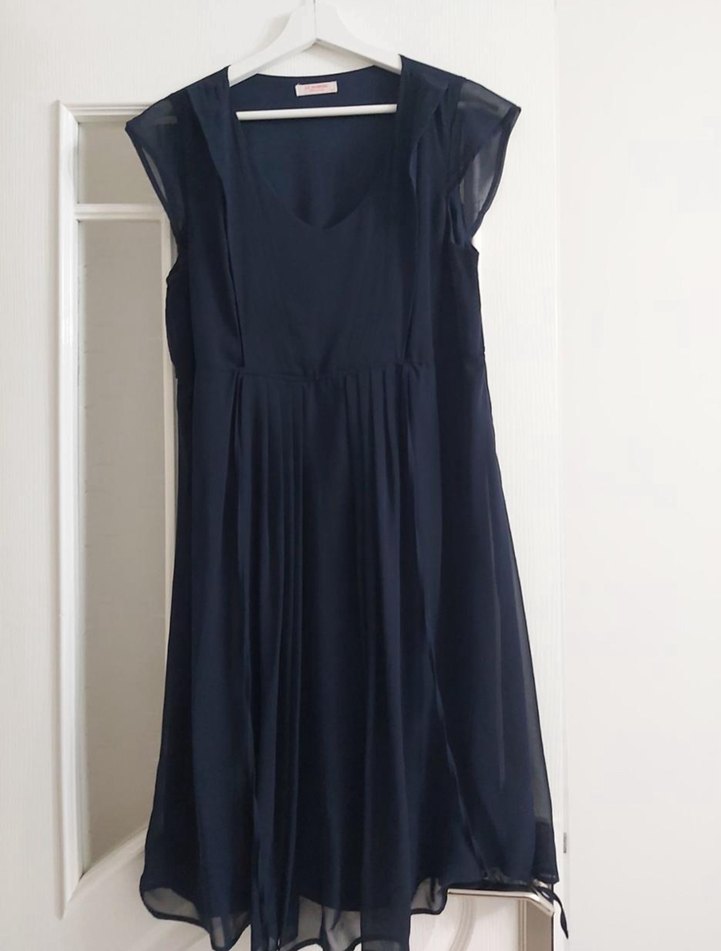 Kolsuz, V yakalı lacivert midi elbise, drapeli tasarımı ve salaş kesimiyle hamilelik ve lohusalık döneminde rahatça kullanıma uygundur.