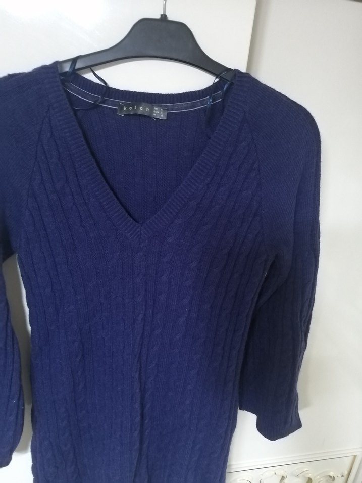 Lacivert örme kazak, V yaka ve uzun kolludur. Fitted, midi boy ve desen içermeyen bu kazak rahat ve şık günlük kullanıma uygundur. Defosu yoktur m bedendir