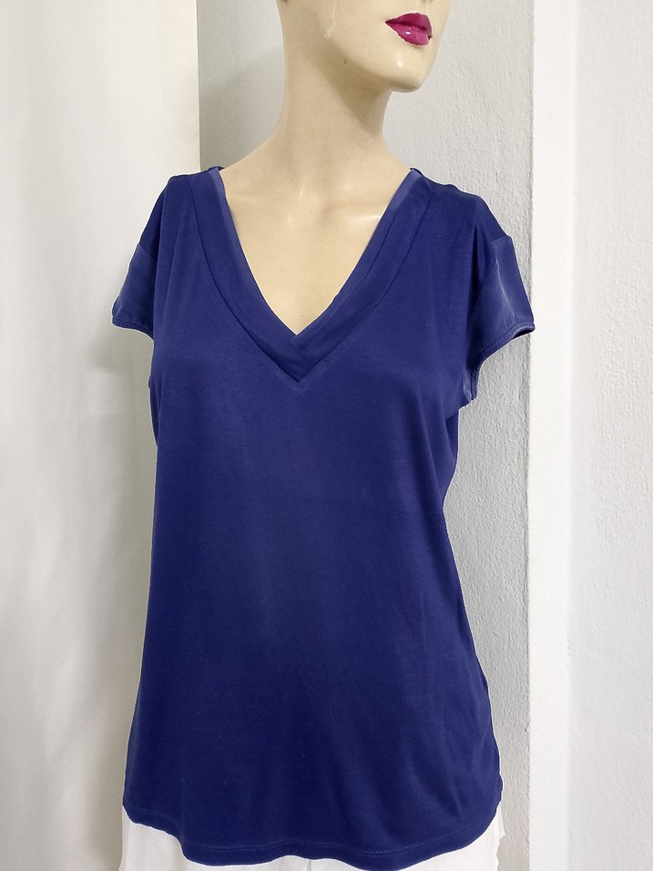Lacivert V Yaka Kısa Kollu Kadın Bluz