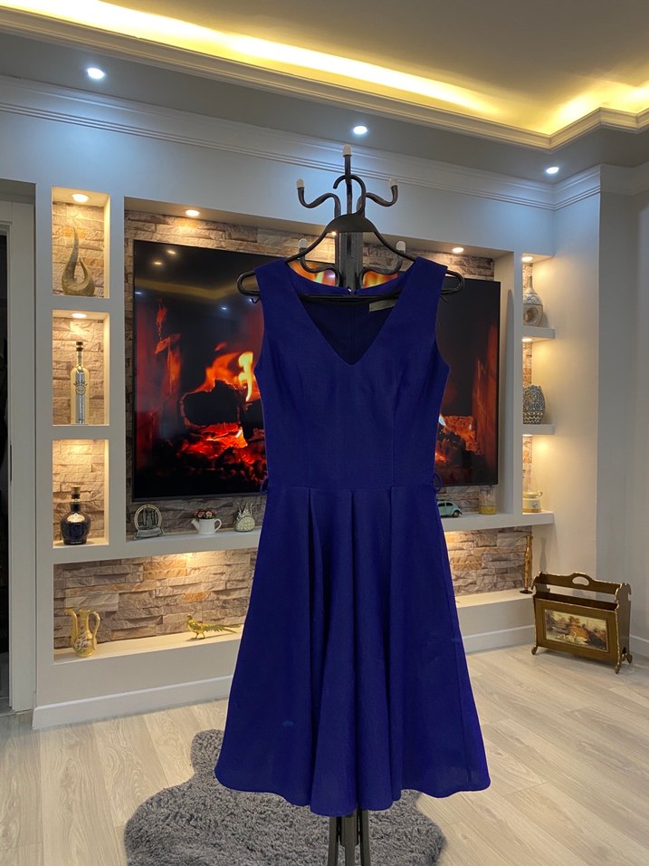 Lacivert, kolsuz, V yakalı, belden oturan ve drapeli midi elbise. Şık akşam partileri için uygundur.