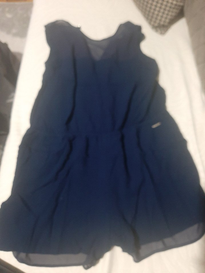 Kolsuz, V yakalı lacivert tulum, bol kesim ve drapeli detaylarla günlük sokak stiline uygun, sentetik kumaştan midi boy.