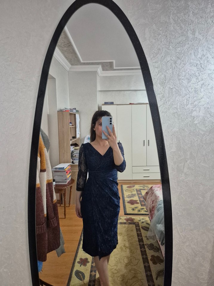 Lacivert midi boy, V yakalı, uzun dantel kollu ve yırtmaçlı, klasik gece stiline uygun elbise.