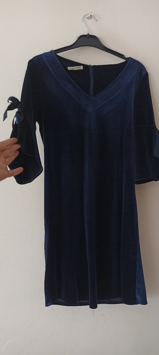 Lacivert midi elbise, V yaka ve uzun kollu, drapeli ve bol kesim, kollarda fiyonk detaylı. Günlük şık görünümler için uygundur. ve kadifelidir