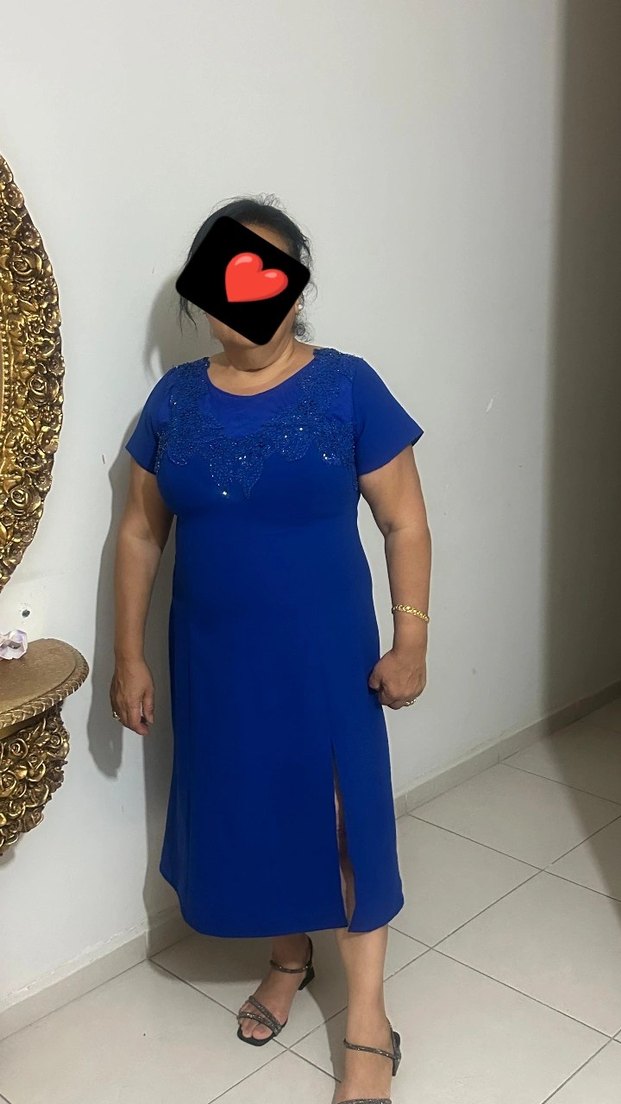 Lacivert, V yakalı, kısa kollu midi boy, bol kesim elbise. Parlak detayları ve sade şıklığıyla romantik akşamlar için uygun.