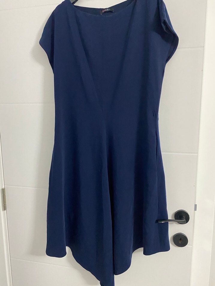 Lacivert midi elbise, V yaka ve kısa kolludur. Drapeli tasarımı ve bol kesimiyle minimalist ve normcore tarzındadır. Ofis kullanımı için uygundur.