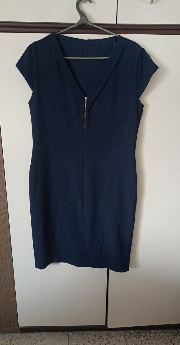 Lacivert renkte, V yakalı ve önden fermuarlı midi kalem elbise. iyi bi markanın etiketi rahatsız ediyor diye çıkarmıştım Kolsuz, düz ve sade tasarımıyla ofis için uygun,boyu 96 cm astarlı