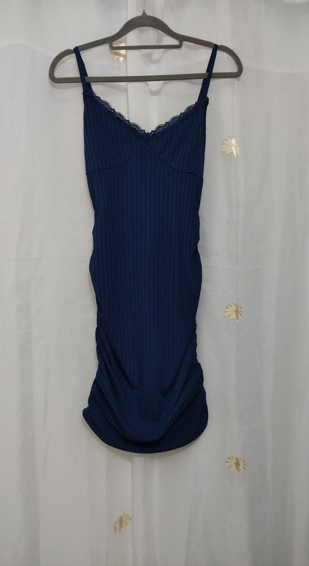 Lacivert, askılı, v yaka, pilili midi uzunlukta triko elbise. İnce ve vücuda oturan kesimiyle dikkat çeker.