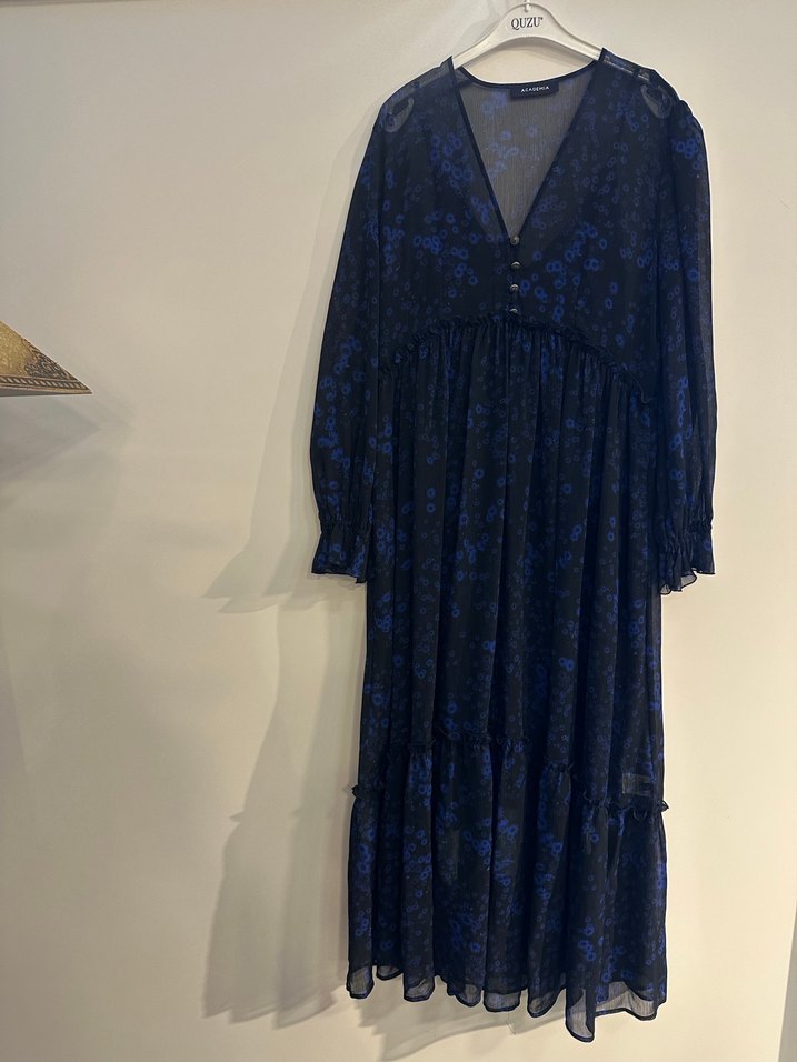 Lacivert uzun elbise, bol kesim ve pilili detaylara sahiptir. V yaka ve ince askılı kollu, hafif batik desenlidir. Bohem ve gotik tarzı yansıtır.