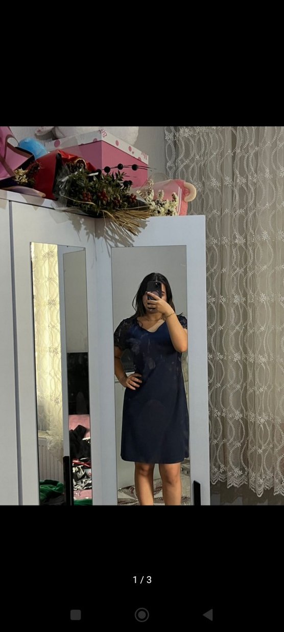 lacivert midi elbise, V yaka ve kısa kollu, bol kesimdir. Denim ve şeffaf detaylara sahiptir. Cesur, minimalist gotik tarzıyla romantik akşamlara uygundur.