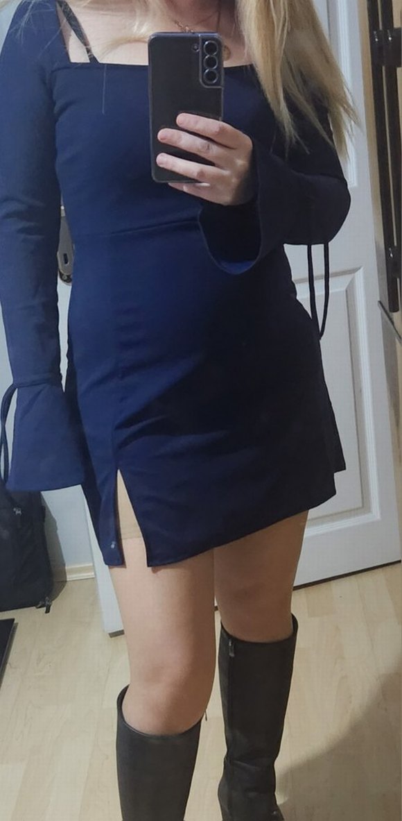 Lacivert süet kumaştan, V yaka ve yırtmaç detaylı, strappy kollu, dar kesim mini elbise. Günlük kullanıma uygun cesur bir sokak stili görünümü sunar. Ürün L yazılmış ama ölçü olarak M bedene