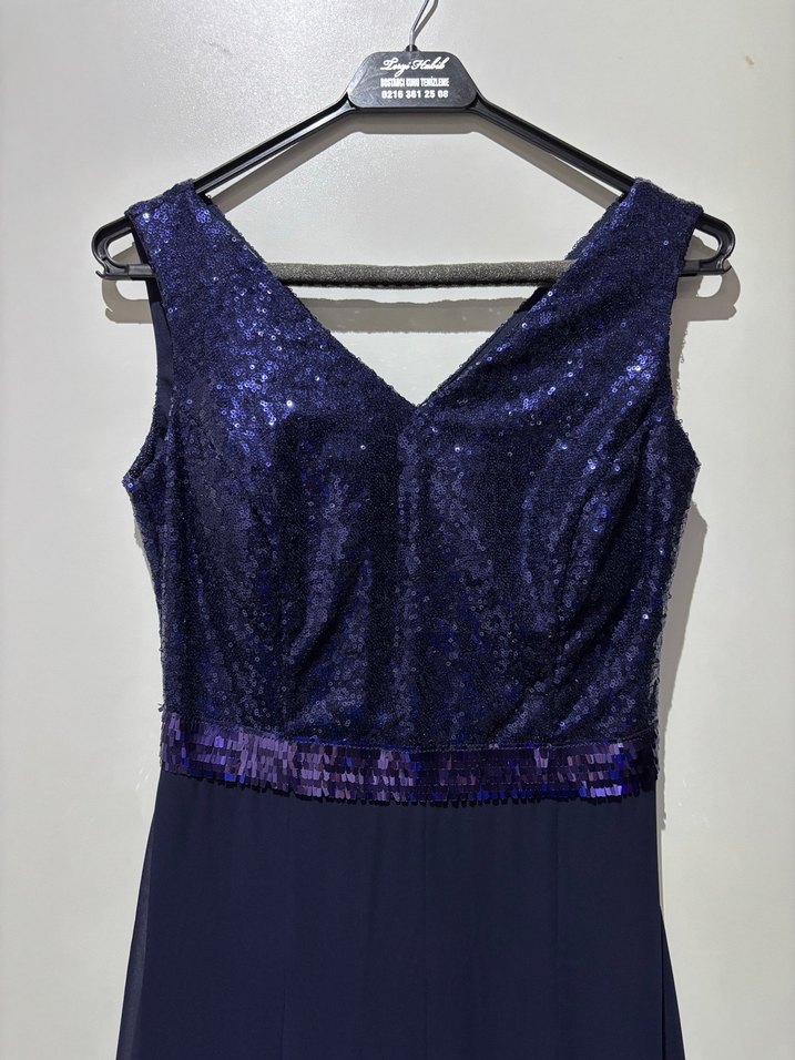 Lacivert, kolsuz, uzun abiye elbise. V yakalı, drapeli ve payet detaylı üst kısmı ile şık bir görünüm sunar. İnce kesimi ve hafif batik deseniyle parti için uygundur. ✨