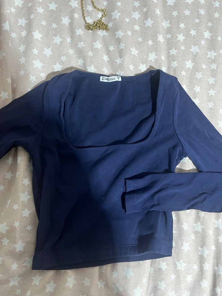 Lacivert renkte, V yaka ve uzun kollu, yumuşak ve sıcak kumaştan yapılmış, normal midi boyda, sade ve şık kadın bluz.