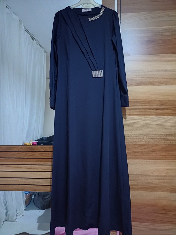 Lacivert uzun elbise tas detayli yandan fermuarli şık tesettur elbise 40 beden yaziyo ama 36 38 bedene daha guzel olur