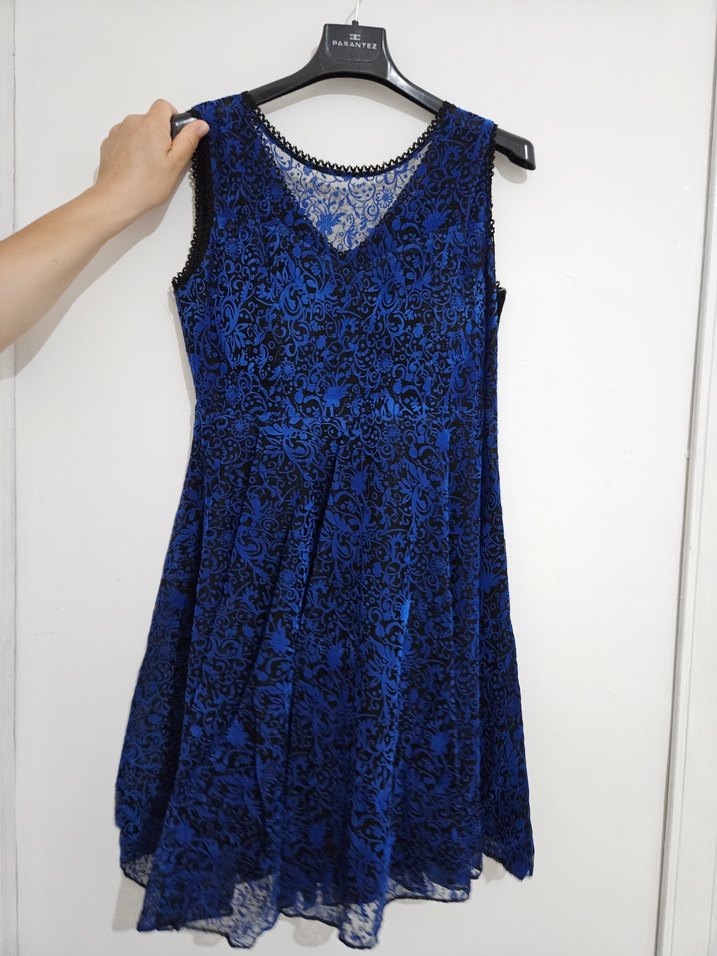 Kolsuz, V yakalı ve dantel detaylı bu dar kesim midi elbise, koyu lacivert batik deseniyle gotik tarzı yansıtıyor. Parti için uygun. Tane fiyatı olup ayrı ilan açılacaktır. mesaj atmadan almayınız.