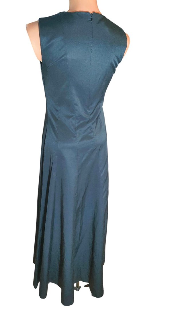 Lacivert uzun elbise, V yaka ve kolsuz kesimiyle drapeli detay sunar. Ofis için uygun, düzenli kesim ve çağdaş tarzda bir parça.