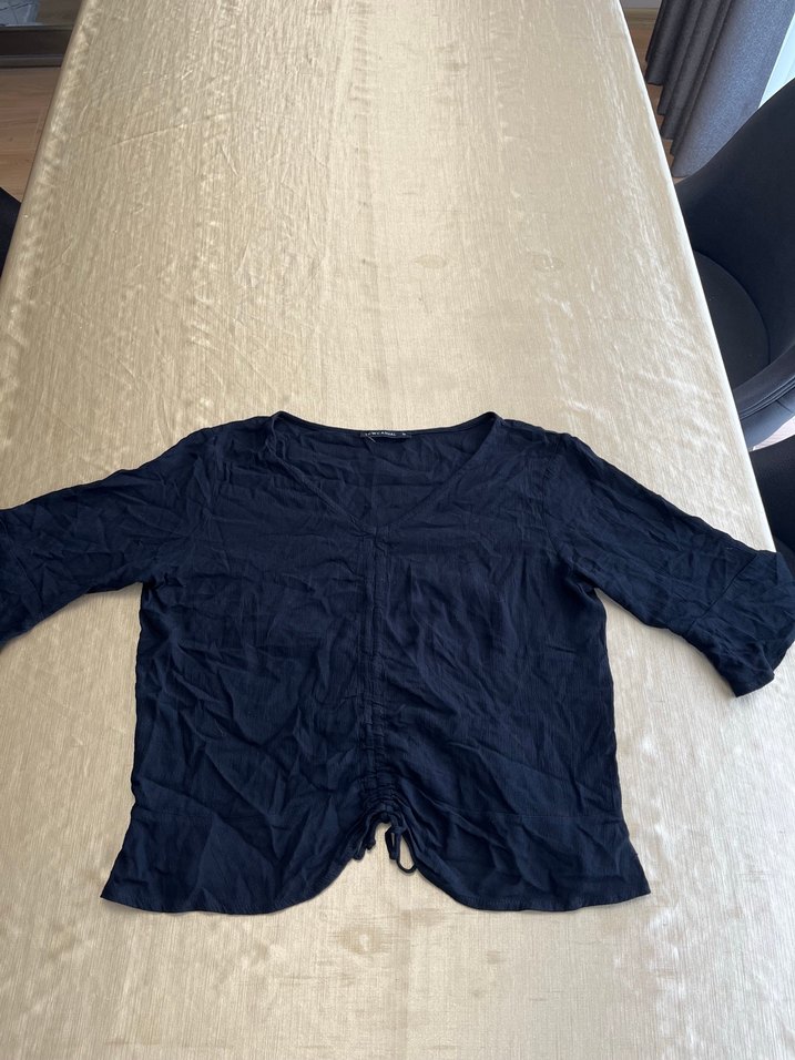 Lacivert kumaştan, V yakalı, uzun kollu, bol kesim midi boyda kadın bluz. Drapeli tasarımıyla sade ve minimal bir görünüme sahiptir.