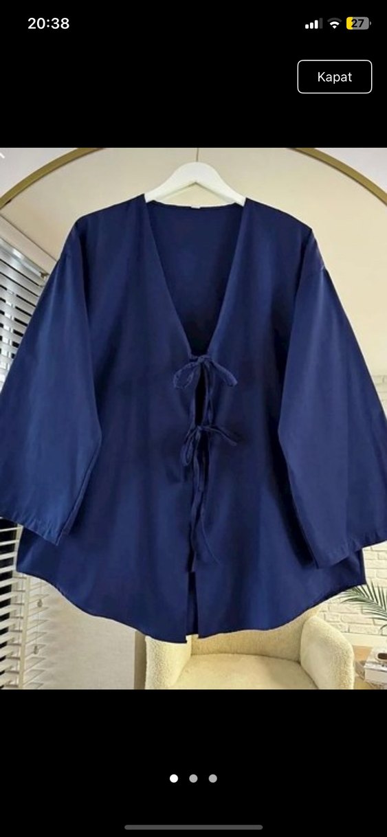 Lacivert keten kumaştan, V yakalı ve drapeli, bol kesim kadın kimono. Uzun kollu ve önü bağcıklı, minimalist bohem tarzı için uygun.