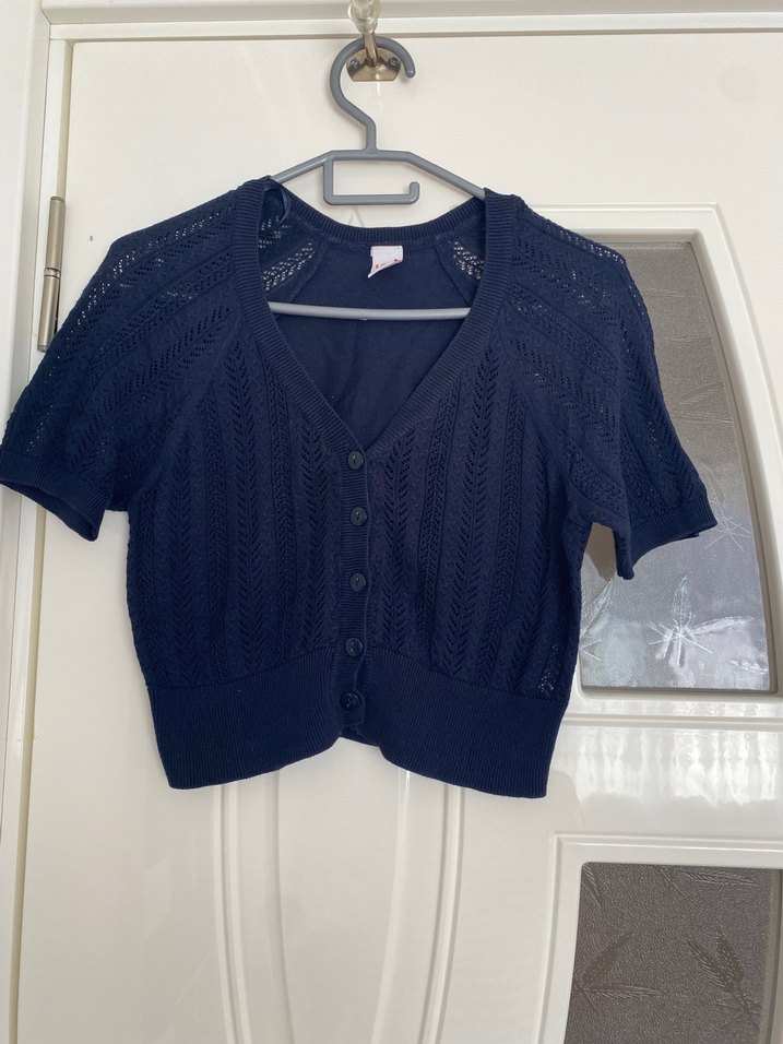 Lacivert renkli, kısa kollu ve V yakalı bu örgü hırka, midi boy ve vücuda oturan kesimiyle günlük kullanıma uygundur. Desensiz ve rahat bir modeldir.