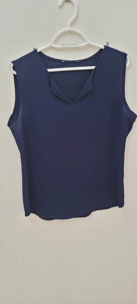 Lacivert renkte, V yaka ve kolsuz, rahat kesim ve düz sentetik kumaştan günlük sokak stili bluz.