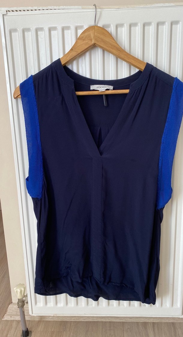 V yakalı, kolsuz, lacivert kadın bluz. Rahat kesimli, dökümlü tasarıma sahip, sentetik kumaştan üretilmiştir. Günlük kullanıma uygundur. Gardropta beklemekten kol kısımlarında yıpranmalar oluşmuş