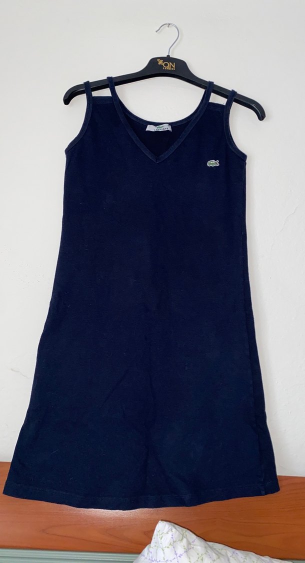 Lacivert, kolsuz, V yakalı midi elbise, sentetik kumaştan, rahat ve salaş kesimli. Günlük sokak stili için uygundur.