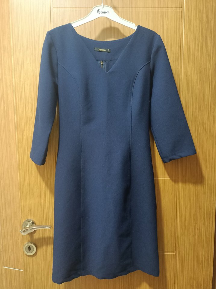 Lacivert renkli, V yakalı ve uzun kollu midi boy kadın elbise, sentetik kumaştan üretilmiş, düzenli kesime sahiptir. Ofis kullanımı için uygundur. ✨