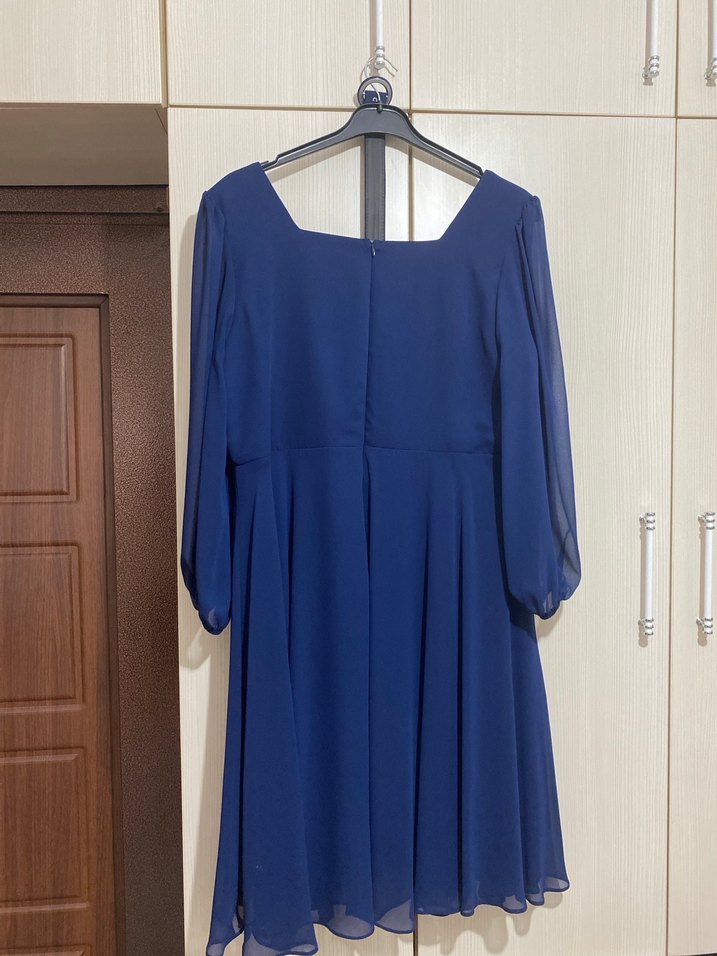 Lacivert renkte, V yakalı ve uzun kollu midi elbise. Salaş kesimi ve drapeli tasarımıyla modern klasik ve minimalist şıklık sunar. Ofis için uygundur. 1 kez , birkaç saatliğine giyildi , herhangi bir sorunu yoktur.