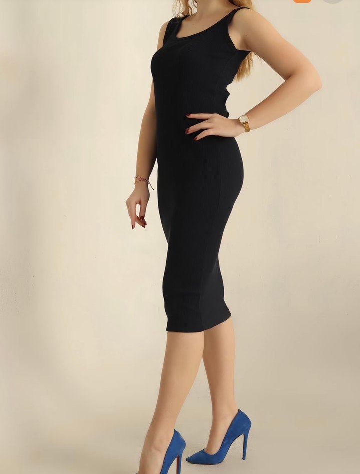 Ürun koyu lacivert rengidir V yaka ve ince askılı, lacivert midi kalem elbise, düz ve kauçuk benzeri yumuşak dokuda, ofis için şık ve cesur bir seçim.