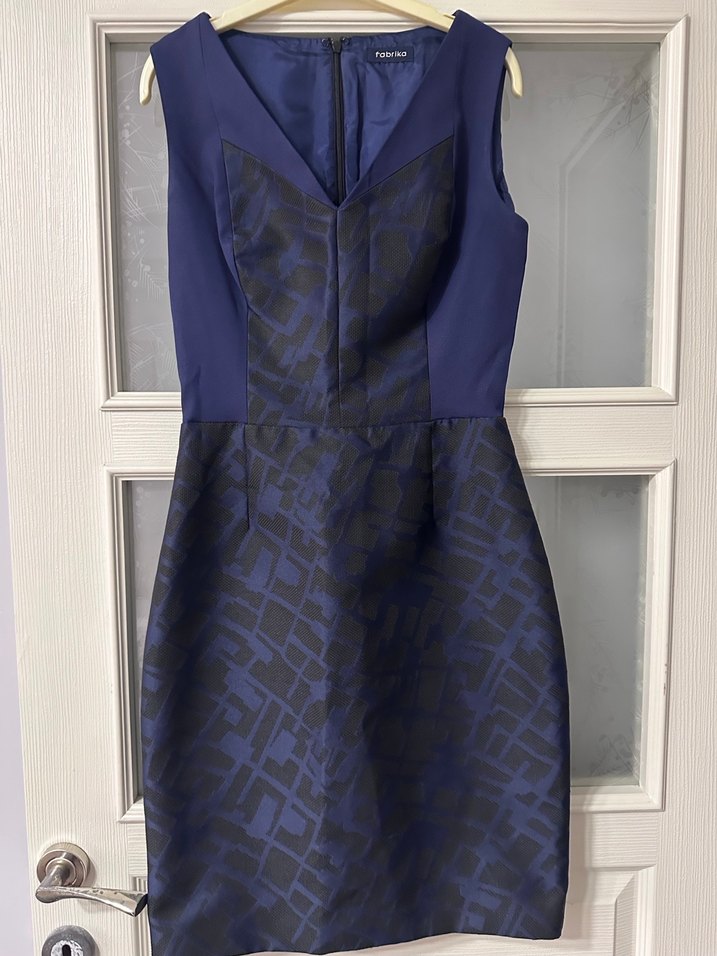 Lacivert, V yakalı ve kolsuz, desenli bu dar kesim midi elbise,oldukça şık ve güzel elbise düğün,nişan, ofis istenilen yerde kullanılabilecek bir elbise