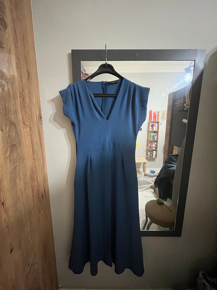 120/36Lacivert midi uzun elbise, V yaka ve kolsuz tasarıma sahiptir. Sentetik kumaştan yapılmış, regular fit ve drapeli, günlük sokak stili için uygundur.