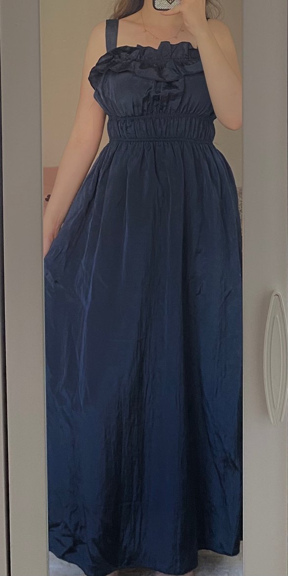 Lacivert uzun günlük parlak kumaşlı elbise hiç giyilmedi etiketiyle duruyor